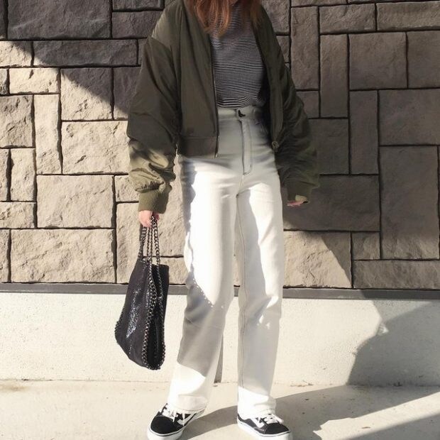 ブラックのステッチが入っているのもコーデのポイントになって良い感じ♪ MA-1とスニーカーを合わせてカジュアルダウン。一本あるだけで、どんなスタイルのコーデにも対応できちゃう!