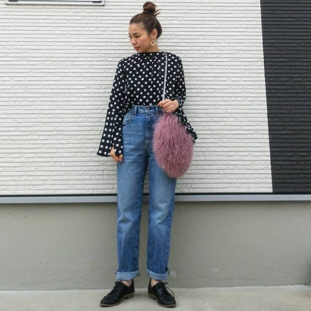 バランスを取るのが難しいフレアスリーブのトップスはこのデニムに合わせるのが正解♪ キュートになりがちな水玉トップスも、スタイリッシュなボトムスで大人コーデにシフトさせちゃおう。
