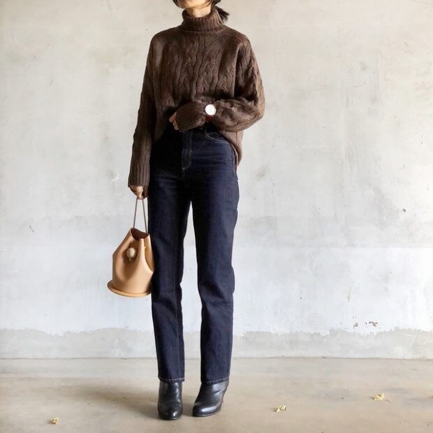 スタイリッシュにキメたいけど、ヒップ周りが気になる人の合言葉は「前だけイン」。高めヒールのブーツを履いてさらに、より美脚に。ニットとバッグをトーン違いの茶系でまとめるのが、高見えコーデのコツ。