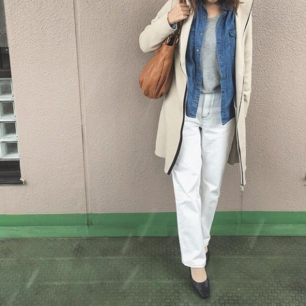 ホワイトデニムはキレイめにもカジュアルにも使える万能アイテム。膨張色のホワイトもこのデニムなら、すっきり着られます。トップスはインして、さらにスタイリッシュに着こなして。