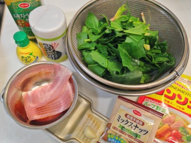 材料はほうれん草1/2袋、ニンニク1片、ベーコン50g、お好みのナッツ、オリーブオイル大さじ2、コンソメ小さじ半、レモン汁小さじ1、塩、黒胡椒です。