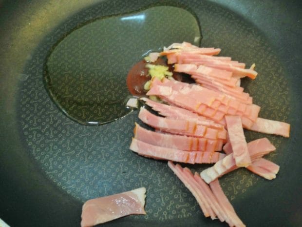 次に、フライパンにオリーブオイルとニンニクを入れ、香りが立つまで温めます。良い香りがしてきたら細切りにしたベーコンを炒めます。