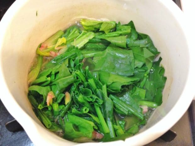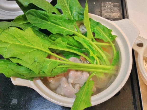 肉に火が通ったら、ほうれん草を根っこの方から投入します。1人用の鍋だとほうれん草の先っぽが出ちゃいますが、だんだん火が通ってクタっとしてくるので、大丈夫。鍋に沿わせてほうれん草全体がだしに浸ったら蓋を閉めて、食卓へ運びます。鍋敷きを準備しておいてくださいね。