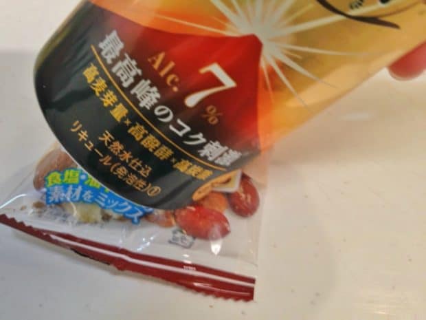 ほうれん草を浸している間に、ナッツを軽く砕いておきます。今回は小袋入りのミックスナッツ(18g入り)を使用。袋のまま、ビール缶などで潰すようにすると簡単に砕けますよ。