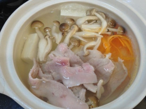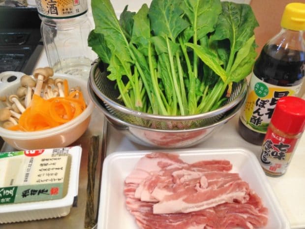 材料は、ほうれん草1/2~1束、豚バラ肉(しゃぶしゃぶ用)150g、しめじ、にんじんなどお好みの野菜と豆腐を食べられるだけ。水600ml、酒100ml、顆粒昆布だしの素小さじ1、ぽん酢、七味唐辛子です。また、締め用にうどんやお餅があると◎。