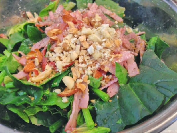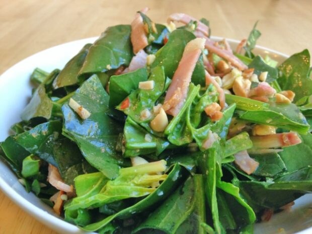 ざく切りほうれん草をボウルに入れ、ナッツ、フライパンの中身、コンソメ、レモン汁も入れ、ざっくりと混ぜ合わせます。ちょっと味見して、塩コショウで味を調えたら完成です♪
