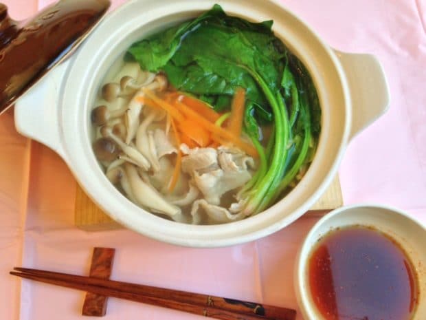 常夜鍋(じょうやなべ)とは、ほうれん草と豚肉のしゃぶしゃぶのような鍋のことです。本来はしゃぶしゃぶのように、食卓で調理するのですが、今回は1人鍋で台所のコンロしかない場合でも大丈夫なアレンジにしましたよ。