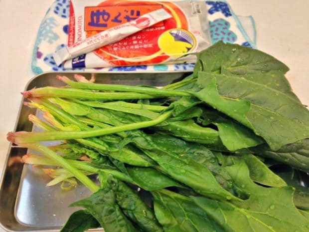 材料は、ほうれん草1/2束(100g)と水200ml、だしの素小さじ2だけの簡単レシピです。