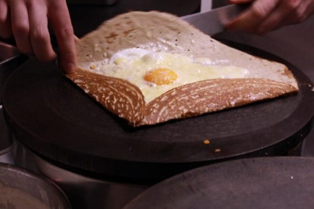 2日間おいて熟成させたそば粉100%のガレットの生地を、200度以上の温度に上がる鉄板で焼きます。