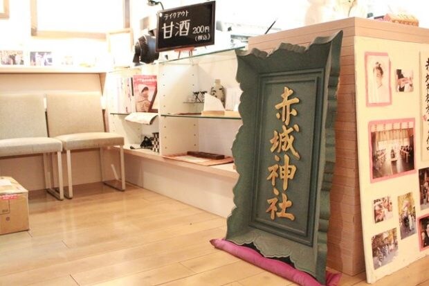 赤城神社の敷地内に位置する「あかぎカフェ」。注文カウンターの前には、昔、神社の鳥居に飾られていた扁額が置いてあります。面白いですね!