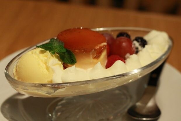 1Fでは、カフェスペースも。筆者は1日10職限定のプリンアラモード(1,058円)を頂きました。濃厚なのにペロッと食べられる軽い口当たりのプリンは必食です!