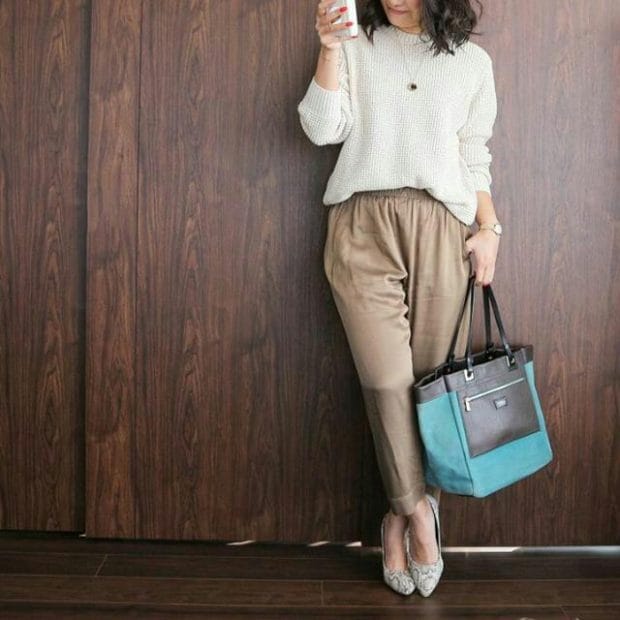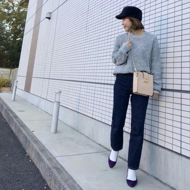 グレーのメンズニットにパンツを合わせたスタイル。ボーイッシュになりすぎるのが気になる人は、バックや靴などのファッション小物で女性らしいカラーを取り入れてみて!