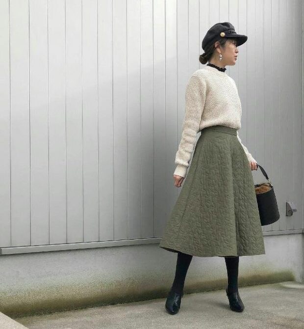 同じくワッフルクルーネックセーター、白ニット。全体的に広がりのあるロングスカートにインすれば、女性らしいシルエットに早変わり! 体のラインは残したいけどゆったりとした着心地が良い! という方にはオススメのコーデ術です。