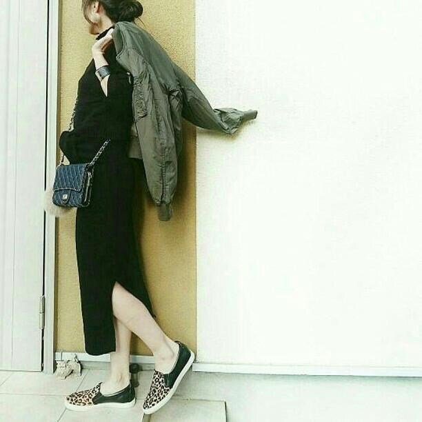 カットが入った黒のタイトスカートスタイルも、あえてのメンズMA-1を羽織れば、甘すぎない印象に。このギャップ感が上級コーデを感じさせてくれますね!