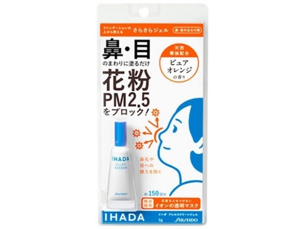 資生堂薬品・IHADA(イハダ)の「アレルスクリーンジェル」は900円(税抜)。鼻や目の周りに直接塗るだけで、花粉やPM2.5を寄せ付けない効果が期待できる商品です。香りはピュアオレンジの香りとユーカリミントの香りの2種類。さらさらのジェルなので、ファンデーションの上からでも使いやすいそう。サイズがコンパクトなので、持ち歩きにもとっても便利です。