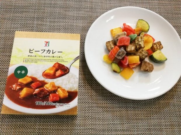 こちらはレトルトカレーと一緒にいただきます。グリル野菜は、写真の一皿で、2/3袋程度を使いました。耐熱皿に乗せて、あとは表示通りにレンジでチンするだけ。ラップも必要ありません。筆者は500Wのレンジで3分半チン。カレーライスの上に盛りつければ完成です!