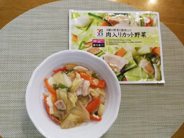 熱したフライパンに油をひき、肉入りカット野菜を炒めます。火が通ったら水溶き片栗粉と鶏がらスープの素を加え煮ます。塩コショウ、しょうゆで味を整えつつ、最後に水溶き片栗粉でお好みのとろみを付ければ完成。あとは、ほかほかご飯に乗っけるだけ。