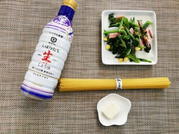 ベーコンほうれんそうを半袋、パスタ、バターと醤油を用意します。ベーコンほうれんそうをバターで炒め、茹であがったパスタを投入。しょうゆをかけ、塩こしょうで味を整えれば……