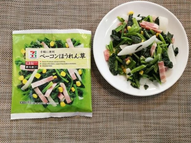 入っているのは、ほうれん草、玉ねぎ、コーン、ベーコンの4種類。内容量は130gです。筆者調べでは、このごろスーパーでも、ほうれん草は200円オーバーなんてことも多いので、このボリューム感でこの価格はとってもお得ですよね!