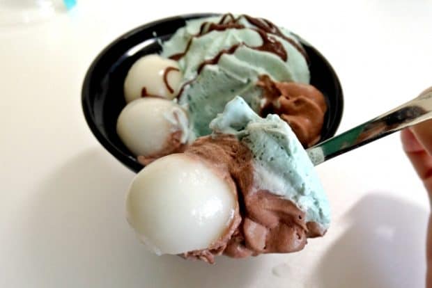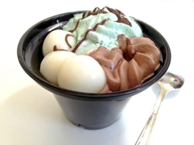 チョコソースのかかったミントホイップとチョコホイップに白玉が添えられている「チョコミントの和パフェ」(298円・税込)。パフェを一旦和風にしたのに、それをさらにチョコミントで洋風にアレンジしているという、冷静に考えると強引な一品です(笑)。