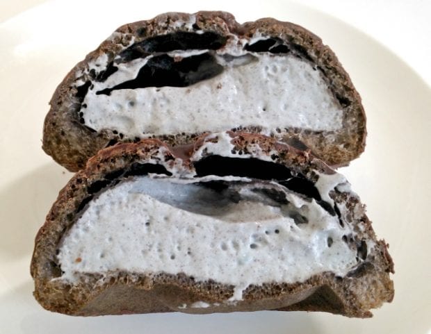 割ってみると、チョコミントクリームがぎっしり詰まっています。チョコミント味のシュークリームなんて聞いたことがない! と思いながらパクリ。