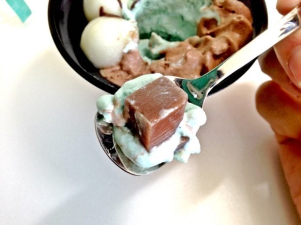 ムース状のチョコミントクリームは、甘さ控え目ですね。ミント感はしっかりありますが、歯磨き粉やミントガムにあるようなスースーする清涼感は控えめなので、食べやすいです。