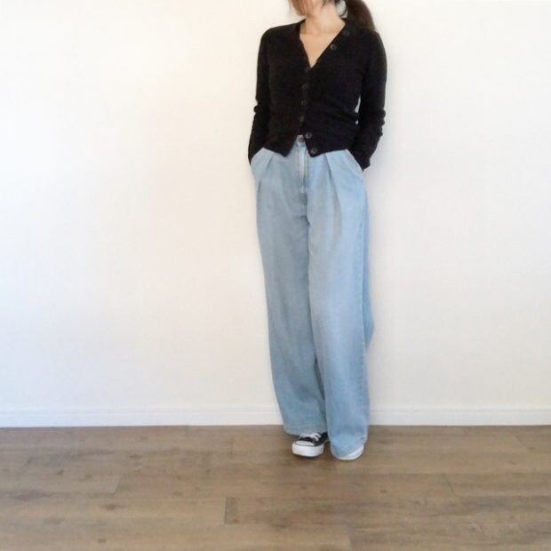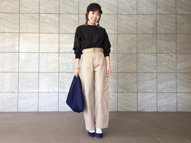 広がりすぎないシルエットでスタイリッシュに着こなせる「ワイドパンツ+E」。脚長効果を出すなら、上半身をコンパクトにまとめるのが鉄則。価格は3,990円(税抜)。