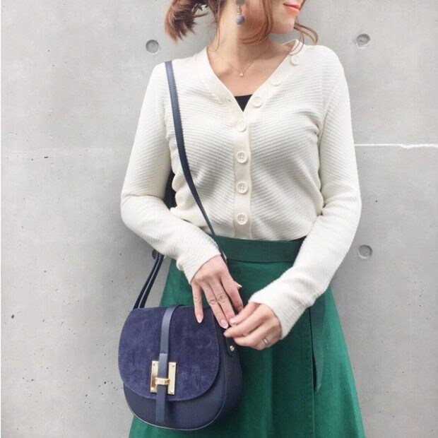 「コットンカシミヤリブカーディガン(長袖)+E」(3,990円・税抜)は、上品な光沢が特徴で、肌触りも◎。 ネックラインは程良い開き具合なので、デコルテ見せすれば大人の雰囲気が漂うコーデに。