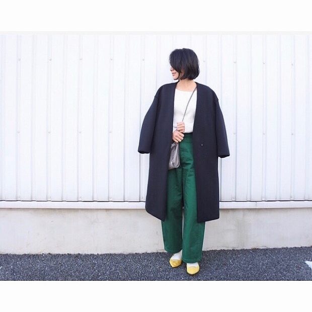 鮮やかなグリーンに心を奪われる! シルエットの良さだけでなく、カラーにも遊び心が感じられるユニクロUのアイテム。ワイドバンツでキレイめスタイルを作り上げて。他にブラックとネイビーのカラー展開がありますよ。