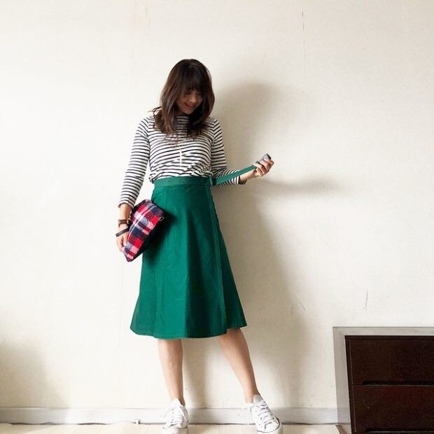 カジュアルコーデの定番ボーダーTシャツだって、このスカートなら上級者のコーデに変身。その他のカラー展開は、ブラック、ベージュです。価格は3,990円(税抜)とこちらもお手頃価格!