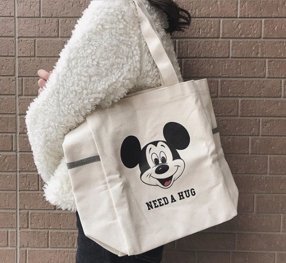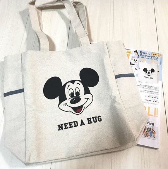 雑誌「mini」3月号の付録は、Lee特製のミッキーマウス柄のビッグトートバッグ。ミッキーマウスのプリントの下には、「NEED A HUG」の文字入り。大人でも持ちやすいデザインとなっています。