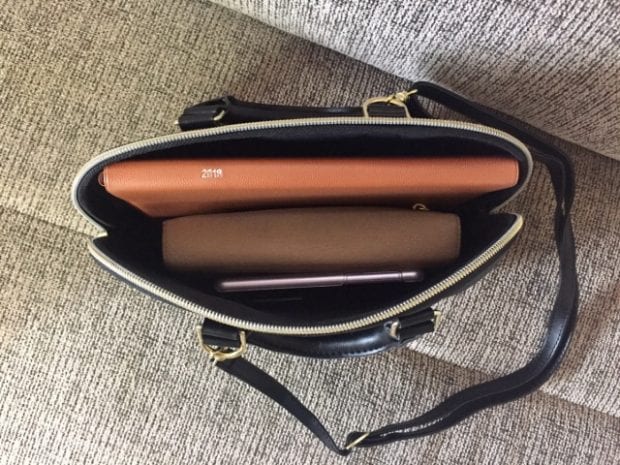 実際に長財布や手帳、スマートフォンを入れてみると、見事にすっぽり収まりました。近所のカフェやコンビニなど、ちょっとしたお出かけにもおすすめです。
