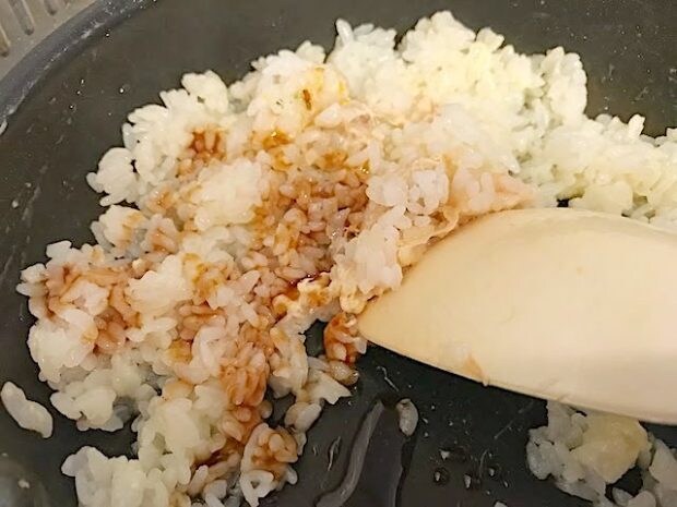醤油小さじ2、みりん小さじ1、砂糖小さじ1を合わせ、焼いているほうの面に何度か塗って、できあがり。ズボラな筆者は合わせ調味料をそのままフライパンに流し込んで、おにぎりと絡めちゃいました。