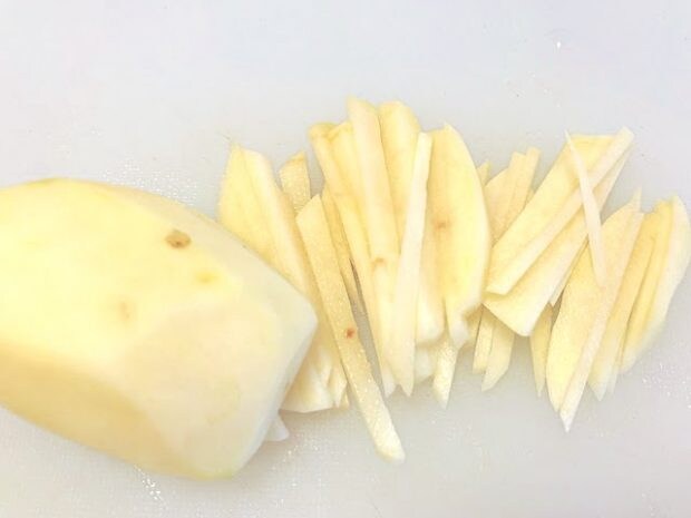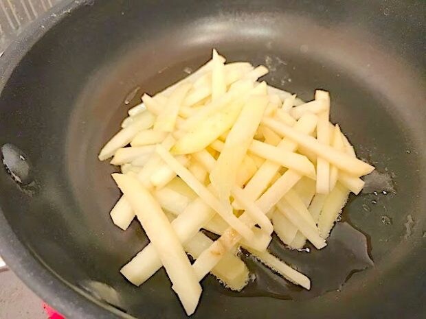 小さめのじゃがいもを千切りにします。太さは均一でなくても大丈夫。