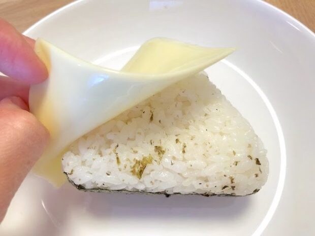 おにぎりの海苔を片側だけはがし、代わりにスライスチーズを1枚乗せます。そのままトースターで3〜4分チン。