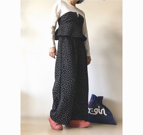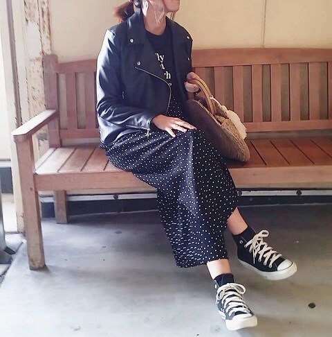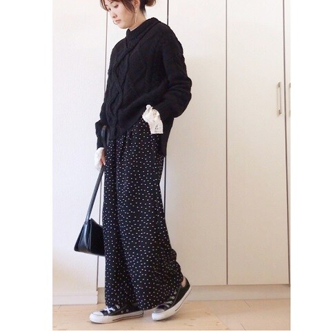 小粒なドットなので、柄ものをあまり着たことがない人も一気におしゃれ上級者に。モノトーンで統一すると取り入れやすい♪