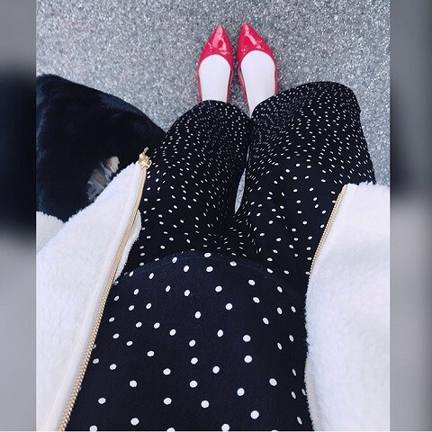 ドット柄と相性がいい、赤のパンプスを取り入れてレトロ感アップ♪