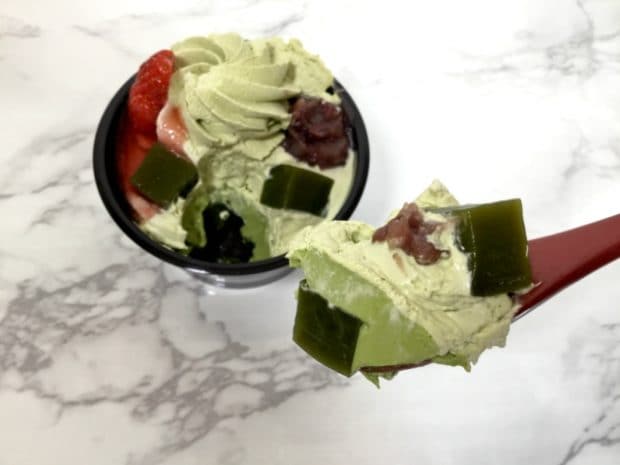 抹茶クリームの下には、抹茶ムースと抹茶ゼリーが埋まっていました。しっかり抹茶の味がします。甘さ控え目で歯ごたえしっかりなゼリーと滑らかなムース、ふわふわのクリームの組み合わせで食感が楽しい♪ いちごソースが甘酸っぱく良いアクセントになっています。もちろんあんことの相性も◎。ゼリーがたくさん入っているせいか、クリーム&ムースがたっぷりな割にはエネルギー控えめな183kcalでした。