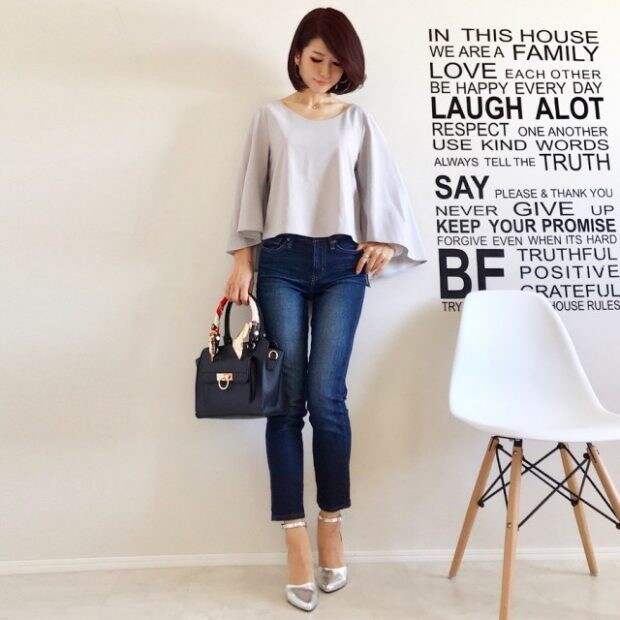 フレアスリーブは、腕周りをスッキリ見せてくれるアイテム。デニムに合わせたシンプルスタイルを高見えに導くコツは、小物! バッグにスカーフを付けるワンテクは今すぐ真似したくなりますよね。足元のシルバーパンプスも、遊び心を取り入れられるアイテムです。