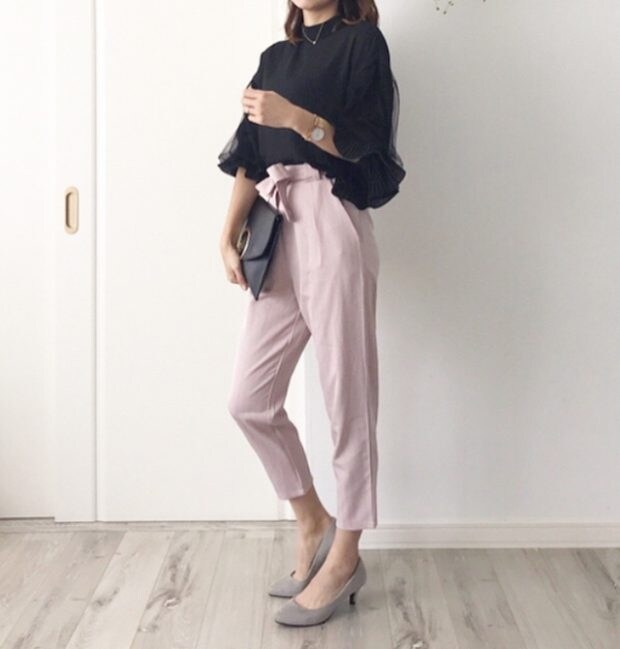 袖をまくれば、ボリュームスリーブのデザインに早変わり。ピンクのパンツに合わせても、ブラックだからスイートさを抑えられる! 透け感のある素材なので、今の時期は長袖、もっと暖かくなったらキャミソールとインナーを変えればロングシーズン着られますよ。
