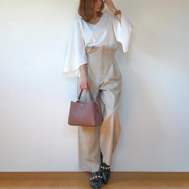 深めのネックラインで、レディ感もアップ。プチプラとあなどるべからず、ディティールのデザインがfifithの魅力なんです。ホワイトを基調にしたコーデは、ベージュや茶系の落ち着いたカラーを合わせれば、大人っぽい雰囲気をまとえます。