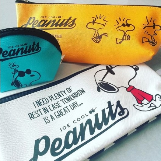 ウッドストックが並んだ中ポーチは、横長なのでペンケースや、メガネケースなどの収納にぴったり。サイズは、(約)タテ7×ヨコ18.5×マチ4.5 cm。
