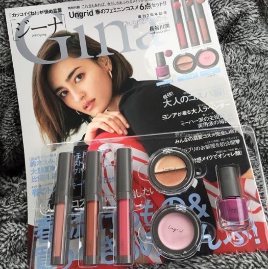 雑誌「Gina」春号のスペシャル付録は、ブランド「Ungrid(アングリッド)」とコラボしたコスメ6点セット。リップグロス3本、ハイライト&ローライト、クリームアイシャドウ、ネイルカラーの豪華付録です。このセットがあれば、目元から口元のメイク、ネイルまでカバーできます。