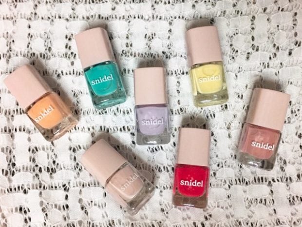 気分が上がる、明るい色のネイルが合計7本。普段あまり使わないカラーも、いろいろ試せるのがうれしい。各5mのミニサイズなので、残すことなく、ワンシーズンで使い切れそうです。どのネイルにも「snidel」のロゴ入りで、インテリアとして置いておいても可愛い。