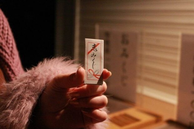 旅の最後は、3,000円旅の定番イベント・おみくじ(100円)を引きに代々木八幡宮へ。すっかり日が暮れて真っ暗だったけれど、お参りをして、おみくじを引くことができました。