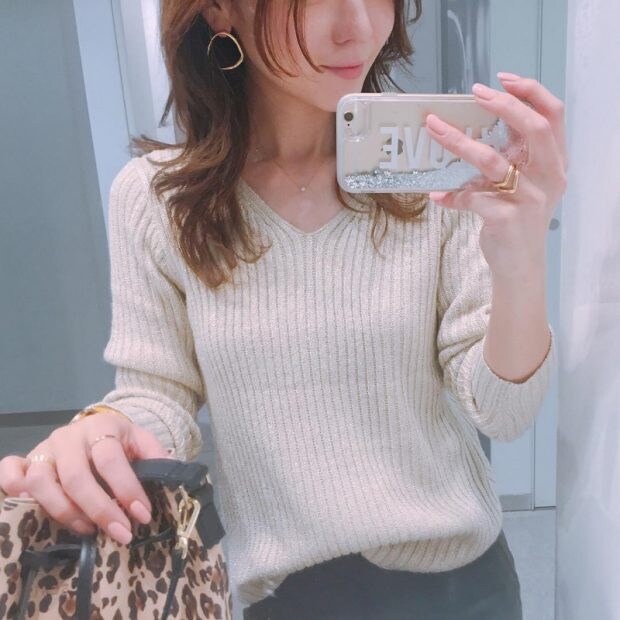 着回し抜群のラメニットプルオーバー。派手すぎないラメがポイントで、アウターなしで過ごしたい春先にぴったり。衿元は前後Vネックで首周りもすっきりとしていて、バックシルエットも大人っぽい一着ですよ。