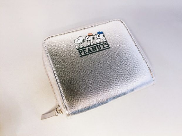 シルバーの財布には、可愛いスヌーピー三兄弟のイラストと「PEANUTS」のロゴが入っています。財布の中を開くと、お札スペースとカードポケットが4つあり、収納力があります。