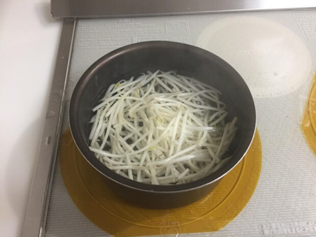 もやしを茹でます。あまり長時間ゆでるとベチャッとしてしまうので、1分くらいでざるに上げて水を切りましょう。