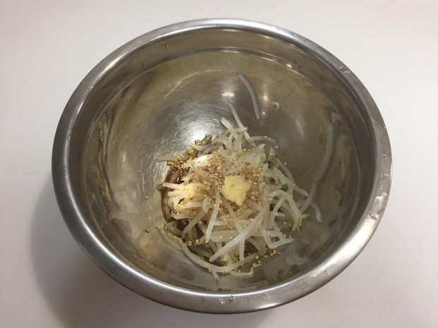 ボールにもやしを入れて、そこに先ほどの調味料を順々に入れていきます。
