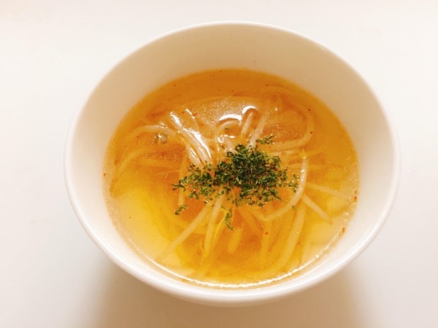 ホットもやしをコンソメスープに入れてみました。ごま油とコンソメの良い香りが漂います。ピリっとした辛みがアクセントになって、パンチが効いたスープになりました!